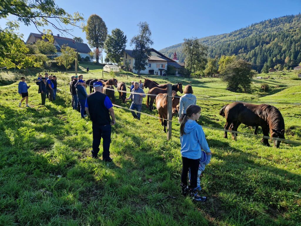 Najprej so se ustavil pri domačiji Omerza, v Zgornijh Ložinah, kjer vzrejajo žrebce SHL pasme. Po dobrodošlici in predstavitvi so nas peljali na pašnik k mirnim, ljubeznivim eno in dvoletnim konjem. Obisk smo zaključil z zajtrkom.