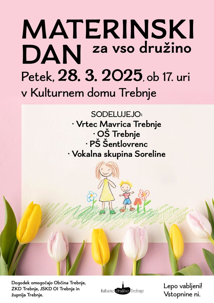 Zadnji petek v marcu je v trebanjskem kulturnem dnevu odmevala pesem, lepa beseda in ples, s katerimi so se manjši in večji otroci želeli zahvaliti mamam in očetom. Nastopil je Otroški pevski zbor iz Podružnične šole Šentlovrenc, ki ga vodi Uroš Primc. Starejši učenci iz Osnovne šole Trebnje so pod mentorstvom Milanke Merzel in Petre Šijanec pripravili deklamacije in razmišljanja o luči in svetlobi v naših življenjih. Zaplesale so male mažoretke Mažoretno-plesne skupine Vrtca Mavrica Trebnje pod vodstvom Petre Slak in Nuše Erjavec. Popoldansko druženje je s pesmima zaključila Vokalna skupina Soreline. Prireditev je organiziralo Kulturno društvo Trebnje, Simona Koščak, ki je dogodek povezovala, pa se je ob koncu zahvalila tudi tistim, ki jih nismo videli nastopati, so pa Materinski dan za vso družino omogočili: Občini Trebnje, Župniji Trebnje, ZKD Trebnje ter JSKD OE Trebnje.