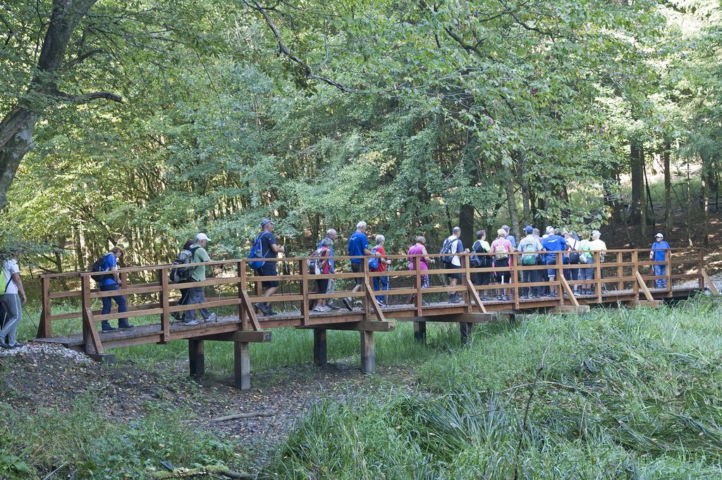 Terasa pohoda je bila glede na prvotno zamišljeno nekoliko spremenjena, odločili smo se namreč, da pohod izvedemo po gozdni cesti, ki je bila na novo urejena pred dvema letoma in vodi okoli hriba Skledica od Pluske do Velike Loke in po drugi strani nazaj do Pluske, le da smo jo tokrat podaljšali do Jurjeve domačije na Občinah, kjer nam je bila predstavljena zgodovina hiše in ogledali smo si njeno notranjost ter tudi skedenj. Z vmesnimi krajšimi postanki smo bili seznanjeni z lokalnimi posebnostmi, s katerimi nas je seznanil Miro.