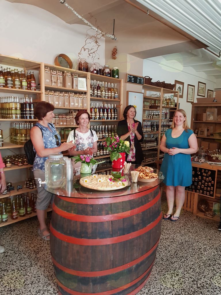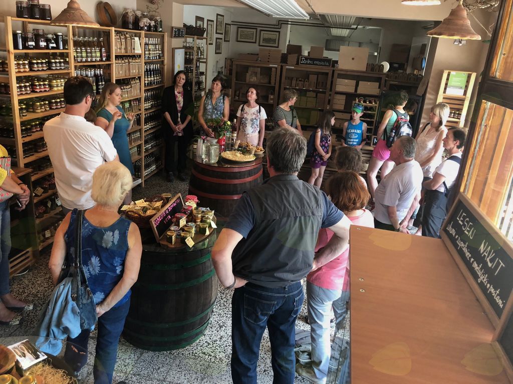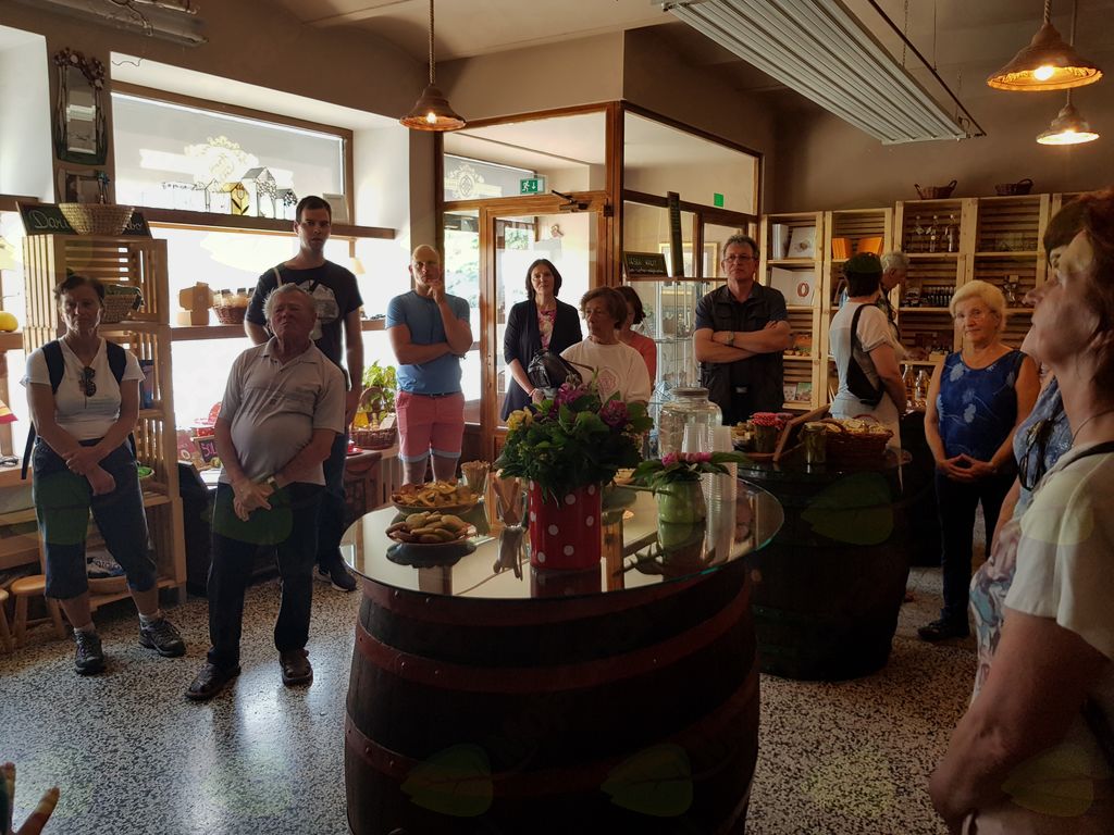 Prvi izlet je vodila izjemno strokovna turistična vodnica Maja Kos. Razgrnila nam je košček zgodovine naše občine na način, da smo ji z veseljem prisluhnili. Najprej smo si ogledali najstarejši trebanjski hotel Grmada, ki v prihodnjih letih čaka na obnovo s pomočjo evropskega razpisa. V sosedni stavbi je svoj prostor našel mednarodni projekt Dobrote Dolenjske / Dolenjska Delights . Vodja projektov Barbara Jerovšek nam je predstavila njihovo dejavnost, začetke celotnega projekta in nakazala smernice nadaljnjega razvoja. Ponudili so nam odličen sir z bučnimi semeni, hruškovo marmelado in domač bezgov sok.
