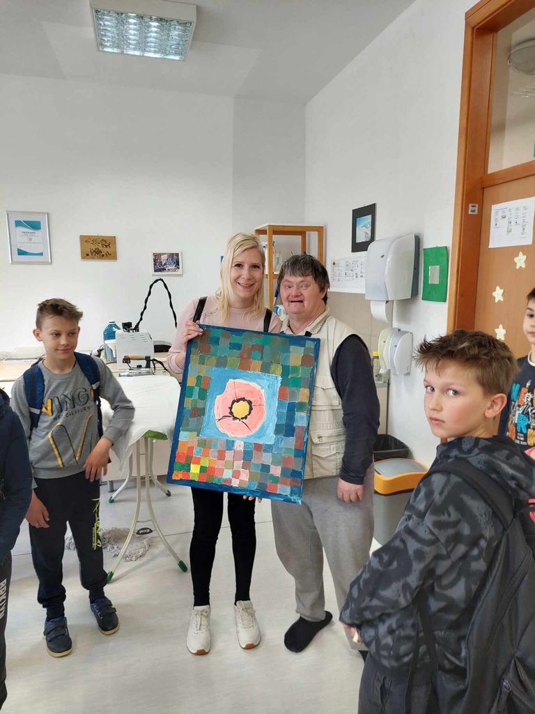 V sredo, 3. 4. 2024, smo učenci iz Dobrniča obiskali Varstveno delovni center Novo mesto. Uporabniki so nas toplo sprejeli z glasbo, postregli so nam tudi čaj in kakav. Ogledali smo si njhove delovne prostore in izdelke, ki jih sami oblikujejo. Učenci so preizkusili uporabo invalidskega vpzička, palice za slepe, hranili so sošolca in se pogovarjali brez besed. Bine nas je presenetil in nam podaril svojo sliko. Hvala.