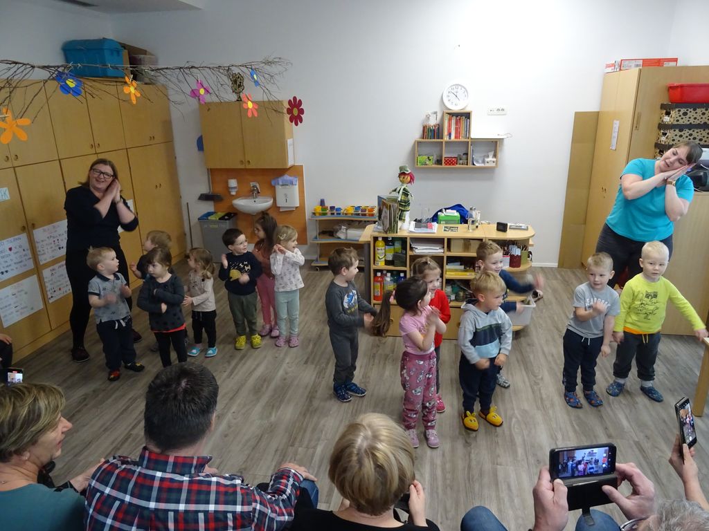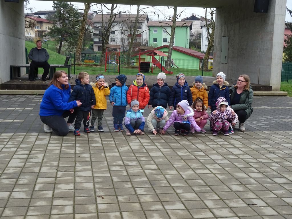 Odpravili smo se do ploščadi pri knjižnici, kjer smo jim pripravili krajši program. Dedki in babice so pokali od ponosa, ko so videli svoje vnuke/vnukinje nastopati. Po končanem programu smo se vrnili nazaj v enoto ter za las pobegnili dežju. V igralnici so nas pričakali slastni piškoti in topel čaj. Po malici je sledil ples z babicami in dedki.