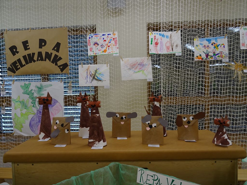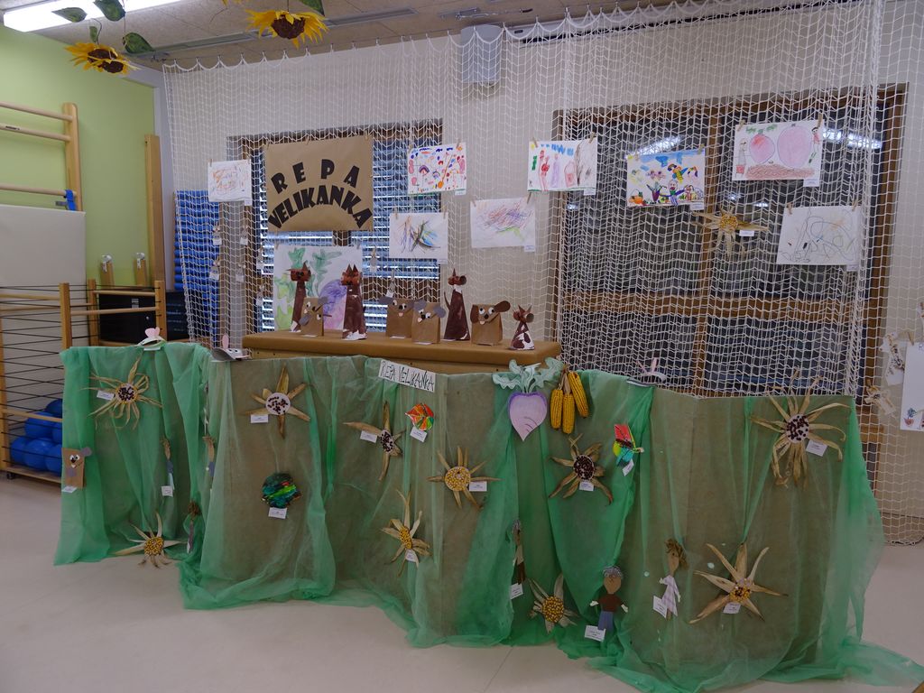 Prvo delavnico smo izpeljali v Tednu otroka, ko smo strokovne delavke otrokom zaigrale lutkovno predstavo z naslovom Repa velikanka (A. Tolstoj). Pogovarjali smo se o vsebini, utrjevali štetje in barve. Tako večji kot tudi manjši otroci so spoznali poljske pridelke in nastopajoče živali, jih poimenovali in z njimi rokovali. Z otroki smo vsebino pravljice povezali z izvajanjem matematičnih aktivnosti povezanih s štetjem, nadaljevanjem vzorcev, razumevanjem predlogov (predvsem na in pod) ter velikostnih odnosov. Največje začudenje je otrokom predstavljalo to, da je miški, ki je bila med nastopajočimi živalmi najmanjša, uspelo izpuliti repo velikanko. Pri tem smo se navezali na temo o strpnosti in prijateljstvu ter se pogovarjali, kako zelo pomembno je spodbujanje spoštljivih medsebojnih odnosov, razumevanja, sodelovanja, prijateljstva in sožitja drug z drugim. Pravljico so otroci tudi likovno podoživljali z ustvarjanjem lutke iz različnih materialov ter z različnimi tehnikami. Otroci so si sami naredili gledališče in igra z lutkami je medse pritegnila tudi mlajše otroke. Pogovor med njimi je potekal verbalno in neverbalno. Starejši otroci so bili zelo izvirni, iznajdljivi in komunikativni. Mlajši pa so največkrat samo opazovali in individualno animirali lutke ter se z njimi igrali.