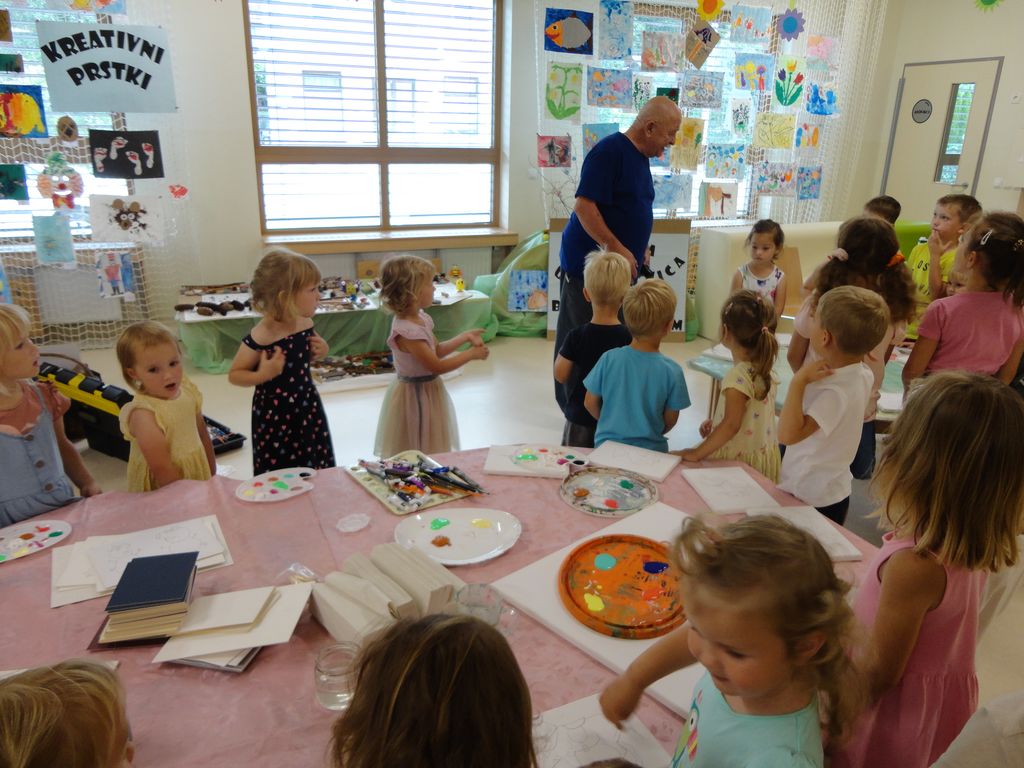 Tako smo ob praznovanju 70. obletnice v vrtcu Mavrica Trebnje povabili v naše okolje ljubiteljskega kulturnika g. Braneta Praznika. Ker nam je ta dan prireditve in druženja prekinilo slabo vreme, nismo vrgli puške v koruzo in smo ga nato povabili v našo enoto Lovrenc. Z otroki je likovno ustvarjal celo dopoldne in jim predstavil likovno tehniko slikanje živali na platno z akrilnimi barvami.