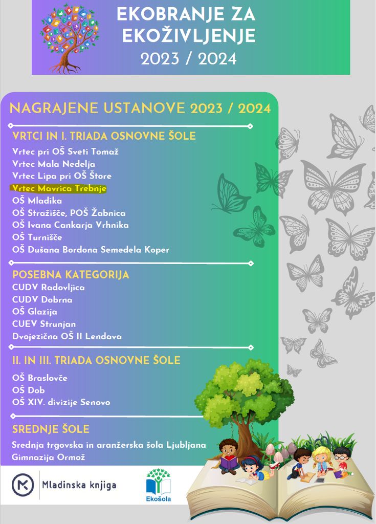 Letos je v projektu Ekobranje za ekoživljenje sodelovalo 409 ustanov - vrtci, osnovne in srednje šole. Namen projekta je razvijanje pozitivnega odnosa do okolja in se vanj aktivno vključevati, izvajanje različnih aktivnosti z ekološkimi vsebinami, ter ustvarjanje konkretnih izdelkov. Nagradni natečaj je potekal v dveh kategorijah - likovni natečaj za mlajše in literarni natečaj za starejše. V okviru projekta so prebirali knjige, povezane z različnimi okoljskimi vsebinami, med najmlajšimi so potovali eko bralni nahrbtniki, ustvarili so najrazličnejše izdelke, plakate, risali, slikali, rezali, lepili...