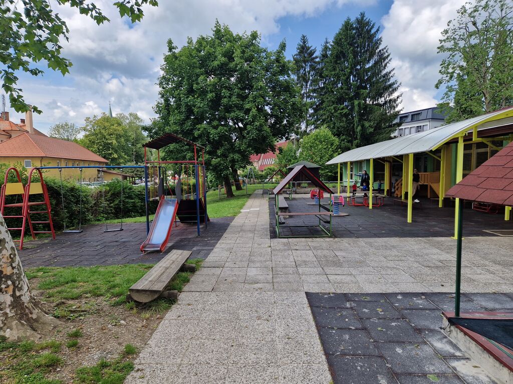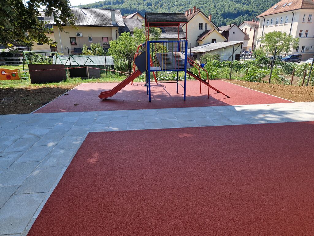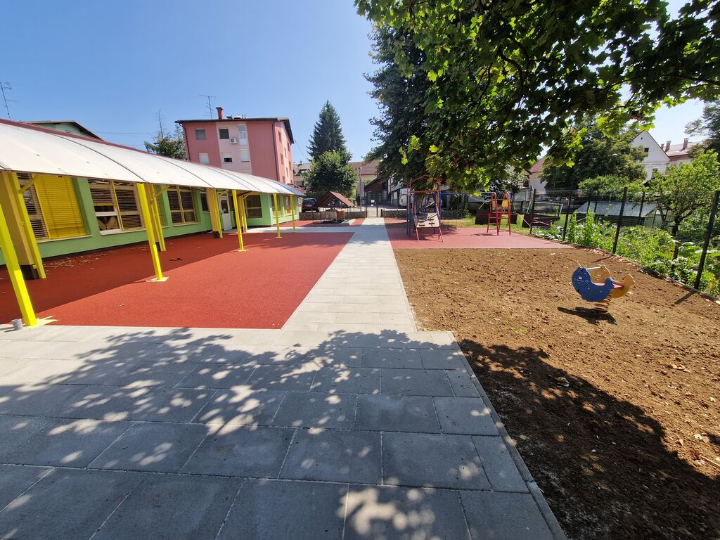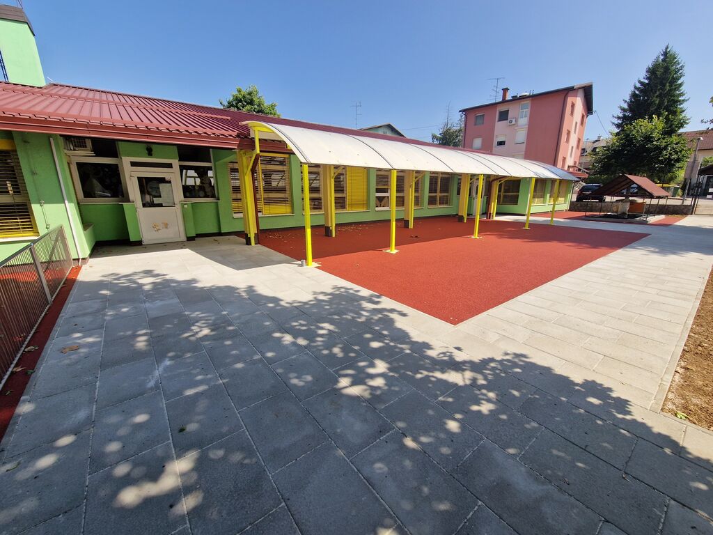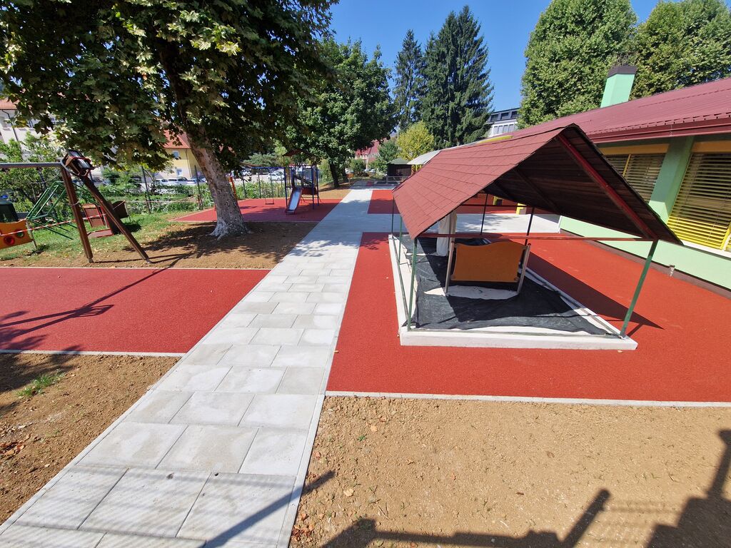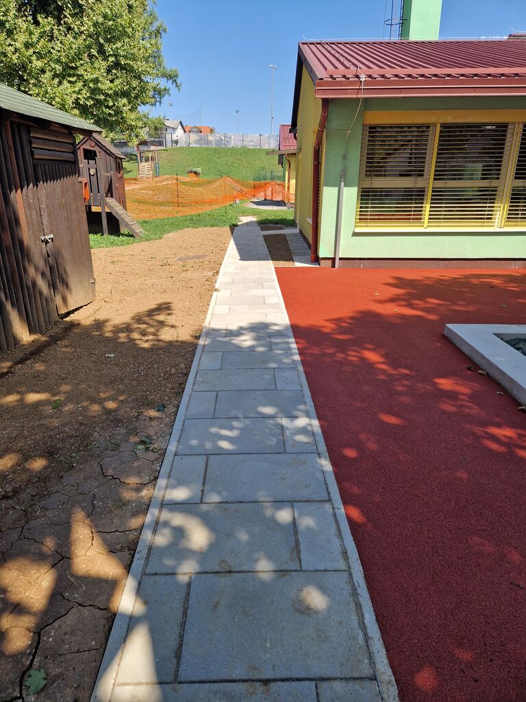 Poseben poudarek smo namenili obnovi zunanjega igrišča pred enoto Ostržek, ki je ena izmed najbolj priljubljenih točk naših malčkov. V sklopu obnove smo zamenjali tartanske plošče, ki so bile že dotrajane, zato se jih je nadomestilo z vlito tartansko podlago. Ob tem so se zamenjane tudi dotrajane betonske pohodne poti.