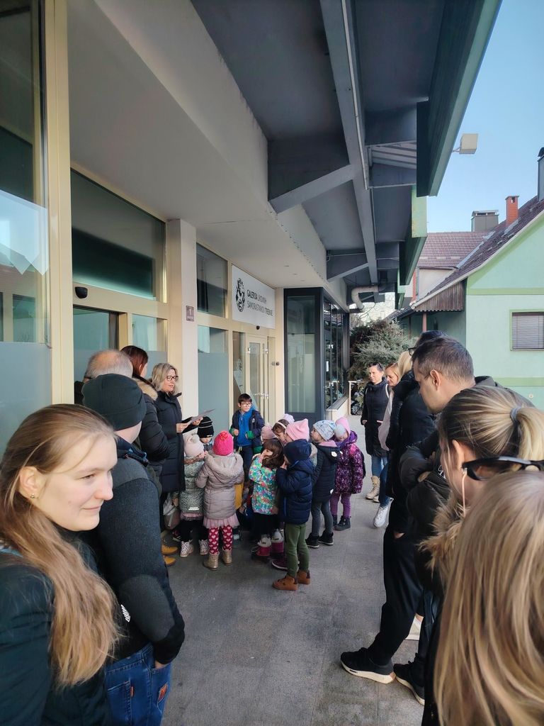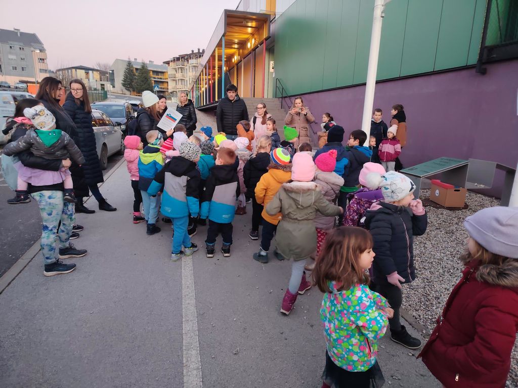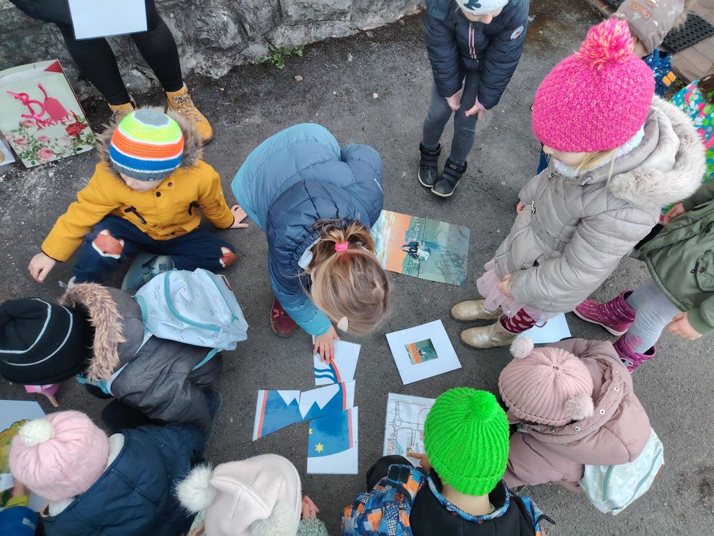 Najprej nas je pot vodila do Knjižnice Pavla Golie, kjer smo se navezali že na prvi državni simbol – pesnika Franceta Prešerna. Reševali smo uganke o njegovem življenju ter skupaj s starši obnovili našo Zdravljico. Otroški zemljevid nas je nato usmeril do Galerije likovnih samorastnikov. Tukaj smo se pogovorili, kaj vse lahko vidimo v galeriji, kdo razstavlja svoje umetnine ter na tej postaji spoznali nov državni simbol Slovenije – grb države. Hkrati pa so otroci aktivno razmišljali in sestavljali vse elemente grba v ustrezno podobo.