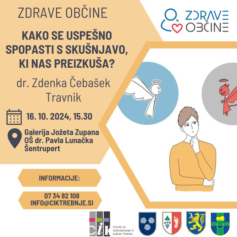 Vabljeni na brezplačno predavanje Kako se uspešno spopasti s skušnjavo, ki nas preizkuša?, v sredo, 16. 10. 2024, ob 15.30 v Galerijo Jožeta Zupana OŠ dr. Pavla Lunačka Šentrupert, Šentrupert 57, Šentrupert. Na delavnico se lahko prijavite TUKAJ.
