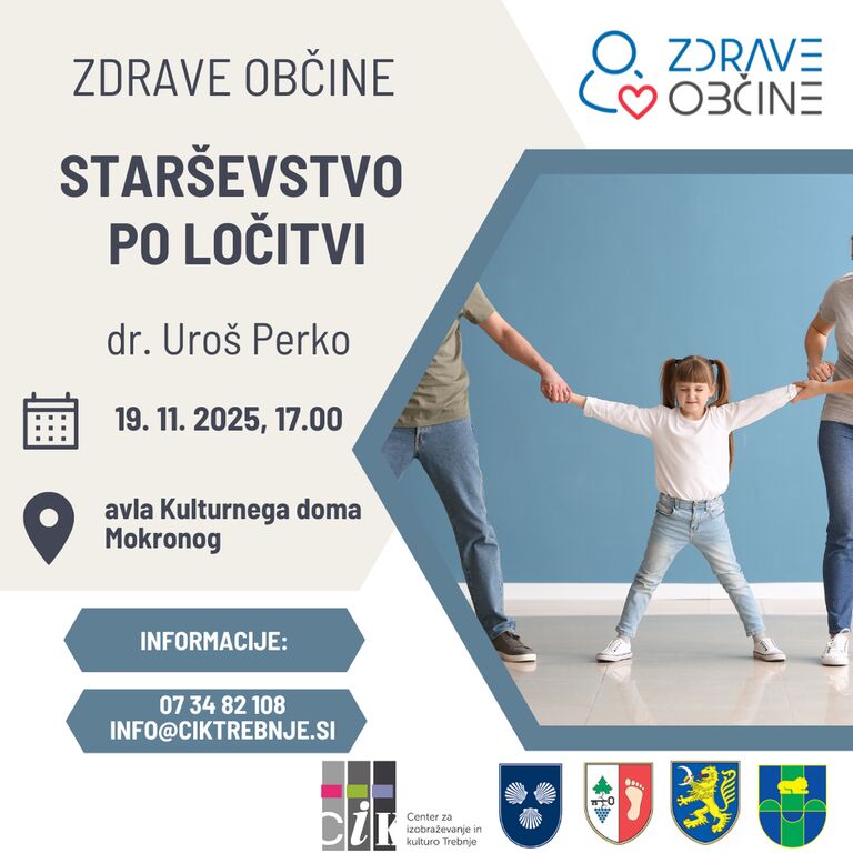 V sredo, 19. 11. 2025, ob 17.00 vas vabimo na brezplačno predavanje Starševstvo po ločitvi. Predavanje bo potekalo v avli Kulturnega doma Mokronog. Predavatelj doc. dr. Uroš Perko, psihoterapevt. Predavanje bomo izvedli v okviru programa Zdrave občine, nanj pa se lahko prijavite na povezavi: https://prijave.snipi.si/2NlkCzh6pWM