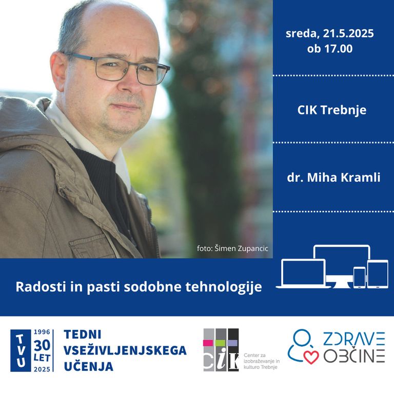 V sredo, 21. 5. 2025, ob 17.00 vas vabimo na brezplačno predavanje Radosti in pasti sodobne tehnologije, na CIK Trebnje (velika predavalnica). Predavanje bomo izvedli v okviru Tednov vseživljenjskega učenja in programa Zdrave občine. Predavatelj dr. Miha Kramli. Na predavanje se lahko prijavite TUKAJ