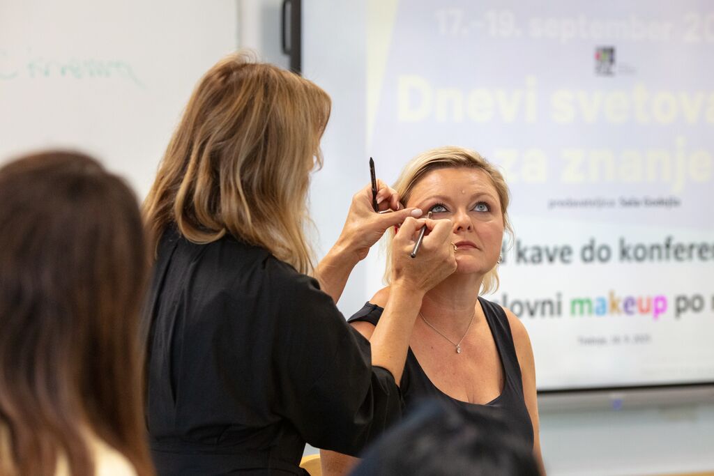 Saša Godejša, svetovalka za ličenje, je na delavnici "Od kave do konference – poslovni makeup po meri" pokazala, kako z ustrezno nego kože in izbiro ličil ustvariti urejen, profesionalen videz, ki odraža osebnost posameznika.