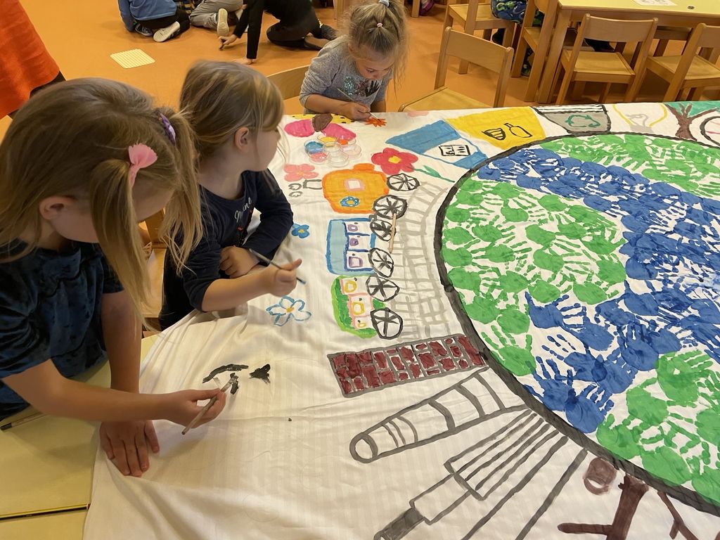 Tri trajnostne grafite, ki so jih ustvarili otroci skupaj z vzgojiteljicami si lahko ogledate v enoti Mavrica, saj so obešeni na ogled v multimedijskem prostoru. Sami smo grafit ustvarili iz stare hotelske rjuhe, ki nam jo je prinesla mamica, lastnica trgovine Tri princeske. Na njo smo s tempera barvo naslikali podobo naše ljube Zemlje. Upodobili smo lepa, dobra ter slaba dejanja, ki vplivajo na naš planet.