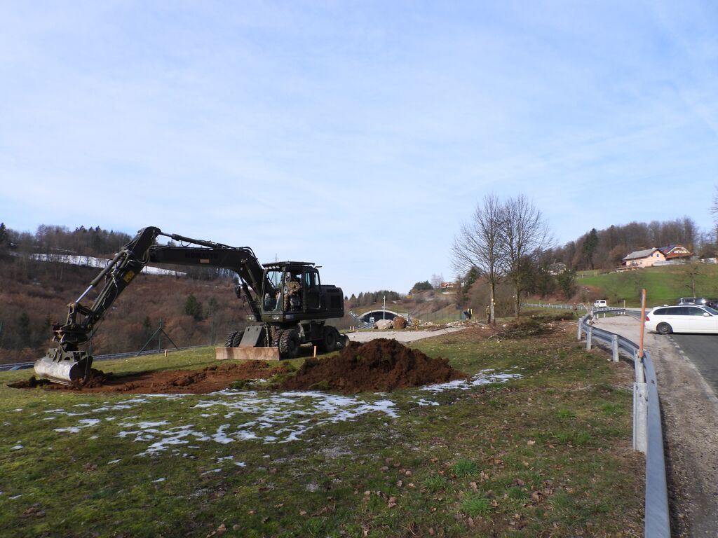 Večji vojaški bager, ki je sodeloval pri nakladanju, je nato že začel odstranjevati kamenje in pripravljati teren za nadaljevanje posega.