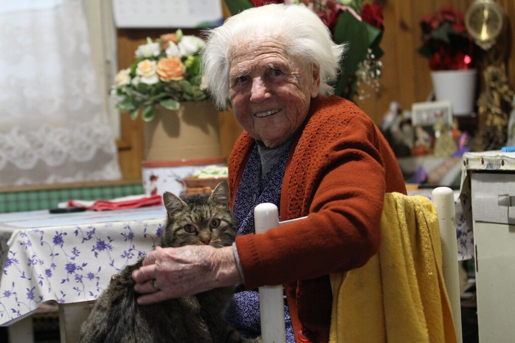 Živi sama v hiši in ko sem potrkal na njena vrata, saj zvonca ni bilo, me je hitro povabila naprej. Sedela je za mizo in v roki je držala palico, s katero si pomaga pri hoji. Kljub drobceni postavi je ob pozdravu močno stisnila roko in se široko nasmejala. Majhen prostor je bil prijetno ogret. »Mami še vedno sama zakuri 'šporhet',« je pristavil njen sin Jože, ki nama je delal družbo.