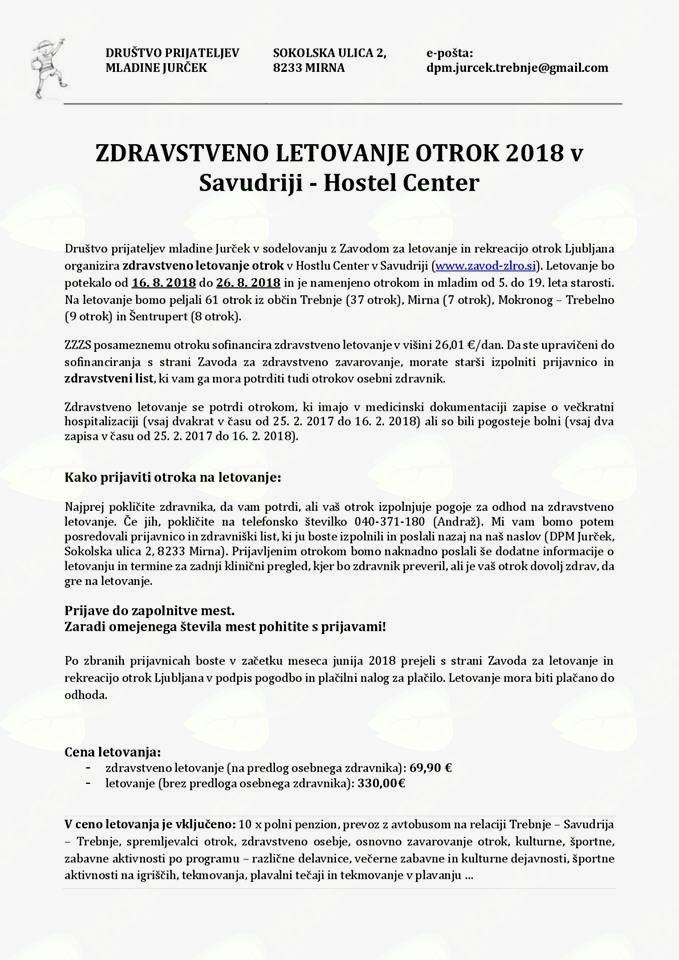 Društvo prijateljev mladine Jurček v sodelovanju z Zavodom za letovanje in rekreacijo otrok Ljubljana organizira zdravstveno letovanje otrok v Hostlu Center v Savudriji. Letovanje bo potekalo od 16. 8. 2018 do 26. 8. 2018 in je namenjeno otrokom in mladim od 5. do 19. leta starosti. Na letovanje bomo peljali 61 otrok iz občin Trebnje. ZZZS posameznemu otroku sofinancira zdravstveno letovanje v višini 26,01 €/dan. Da ste upravičeni do sofinanciranja s strani Zavoda za zdravstveno zavarovanje, morate starši izpolniti prijavnico in zdravstveni list, ki vam ga mora potrditi tudi otrokov osebni zdravnik.