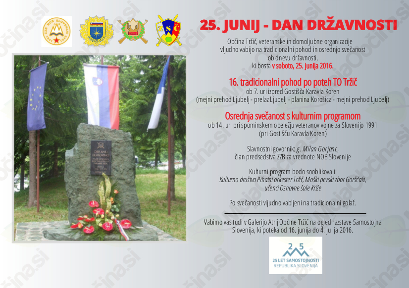 Občina Tržič, veteranske in domoljubne organizacije vljudno vabijo na tradicionalni pohod in osrednjo svečanost ob dnevu državnosti, ki bosta v soboto, 25. junija 2016. Vabljeni na 16. tradicionalni pohod po poteh TO Tržič (ob 7. uri izpred Gostišča Karavla Koren). Osrednja svačanost s kulturnim programom bo ob 14. uri pri spominskem obeležju veteranov vojne za Slovenijo 1991. Slavnostni govornik bo Milan Gorjanc, član predsedstva ZZB za vrednote NOB Slovenije. Kulturni program bodo sooblikovali Kulturno društvo Pihalni orkester Tržič, Moški pevski zbor Gorščaki, učenci OŠ Križe. Po svečanosti vljudno vabljeni na tradicionalni golaž.