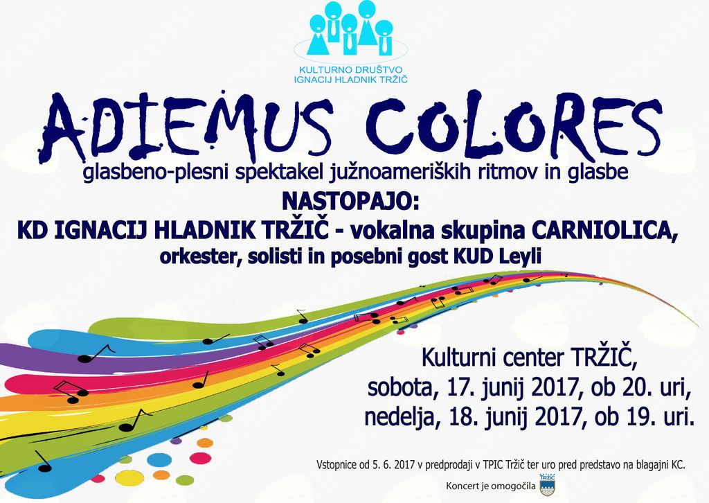 Vokalna skupina Carniolica iz KD Ignacij Hladnik vam v glasbeno plesnem spektaklu predstavlja glasbeno mojstrovino Karla Jenkinsa ADIEMUS COLORES. Slišali boste latino ritme argentinskega tanga, brazilske sambe, španskega bolera… s pridihom afriške plemenske glasbe v izvedbi orkestra, solistov in plesalk KUD Leyli. Prva izvedba v Sloveniji. Poslastica, ki je ne smete zamuditi!