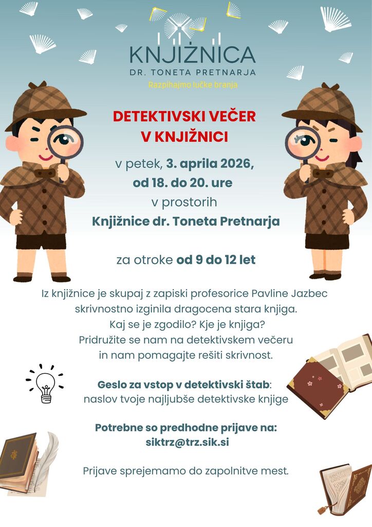 V petek, 3. aprila 2026, ob 18.00 vabimo otroke, stare od 9 do 12 let, v Knjižnico dr. Toneta Pretnarja na napeto detektivsko dogodivščino.
