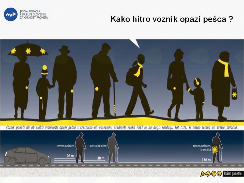 Največ nesreč z udeležbo pešcev se zgodi prav v jesenskih in zimskih mesecih, ko so dnevi krajši, vidljivost slabša, ceste pa so spolzke. Zato je pomembno, da pešci z uporabo odsevnikov poskrbijo za svojo vidnost, vozniki pa da zmanjšajo in prilagodijo hitrost vožnje v naseljih ter pešcem odstopijo prednost na prehodih.