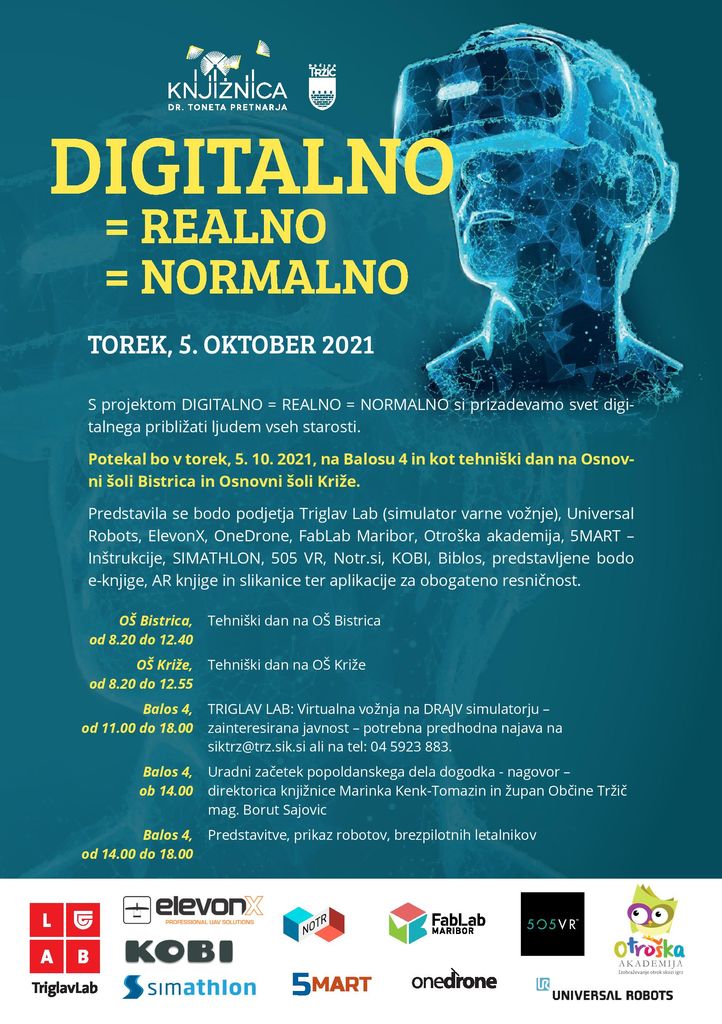 DIGITALNO = REALNO = NORMALNO je enkraten dogodek, ko v Tržič pridejo izjemna podjetja z napredno tehnologijo, zato vabljeni k obisku. Kaj ne bo vredno od blizu videti mogočnih dronov in robotske roke?