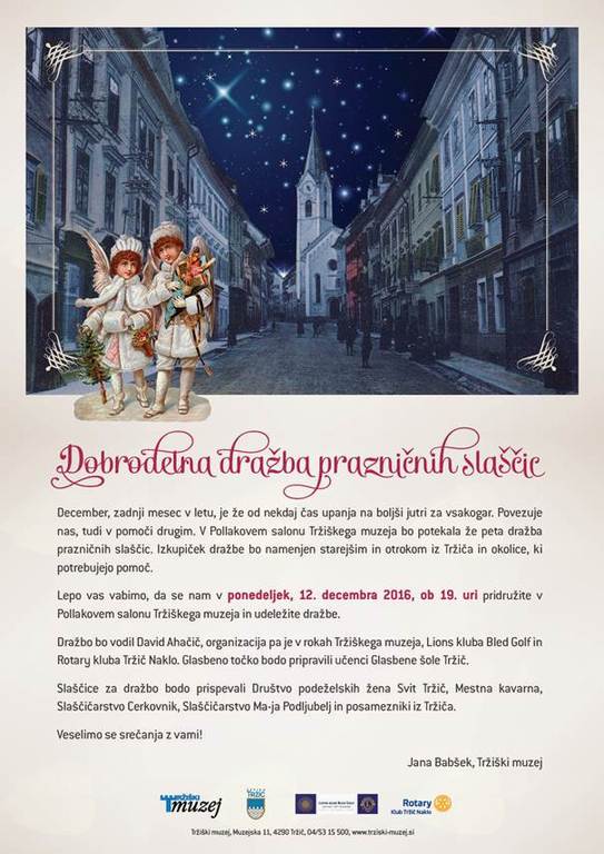 Dobrodelna dražba prazničnih slaščic bo v ponedeljek, 12. decembra 2016, ob 19. uri v Pollakovem salonu Tržiškega muzeja.