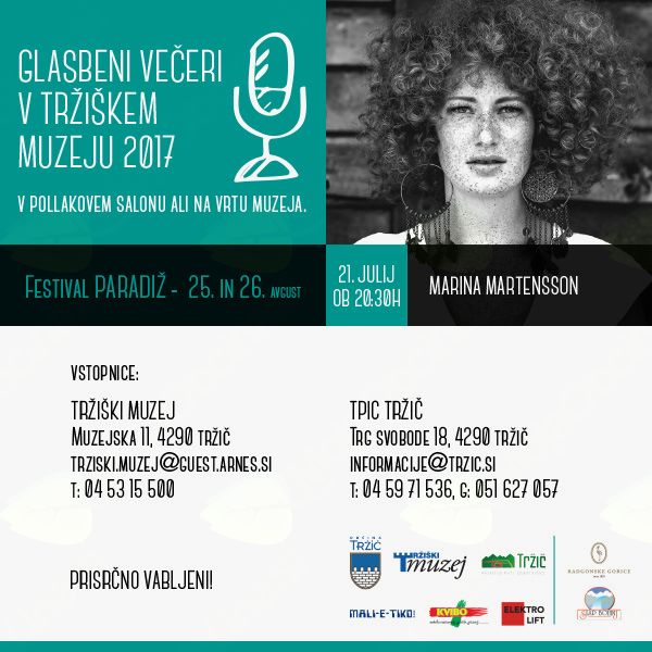 Nastopila bo odlična Marina Martensson, švedska pevka in kantavtorica slovenskih korenin, ki občinstvo navdušuje z jazz-pop melodijami in unikatnimi priredbami dobro poznanih pesmi v njeni prav posebni čustveni interpretaciji.
