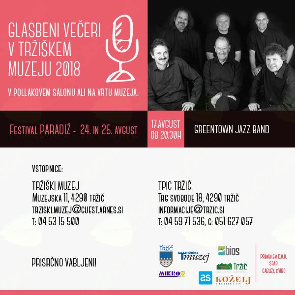 Pridružite se nam na zadnjem glasbenem večeru na vrtu Tržiškega muzeja v petek, 17.8.2018, ob 20:30 uri. Na ta poletni večer nas bodo ogreli vrhunski glasbeniki Greentown jazz banda, ki velja za eno najboljših tradicionalnih jazz skupin v Evropi. S svojimi nastopi so navdušili tudi občinstvo drugod po svetu, saj se udeležujejo različnih jazz festivalov.