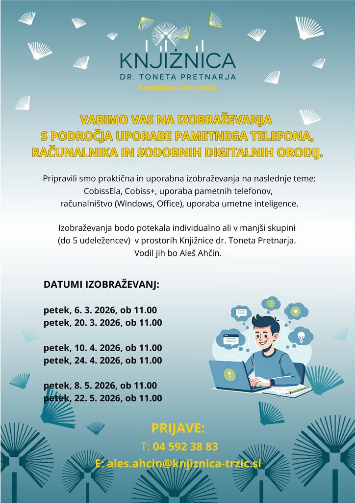 Pripravili smo praktična in uporabna izobraževanja na naslednje teme: CobissEla, Cobiss+, uporaba pametnih telefonov, računalništvo (Windows, Office), uporaba umetne inteligence.