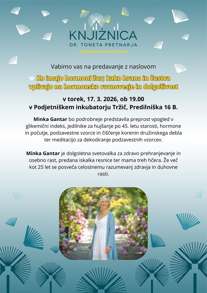 Minka Gantar bo podrobneje predstavila preprost vpogled v glikemični indeks, jedilnike za hujšanje po 45. letu starosti, hormone in počutje, podzavestne vzorce in čiščenje korenin družinskega debla ter meditacijo za dekodiranje podzavestnih vzorcev.