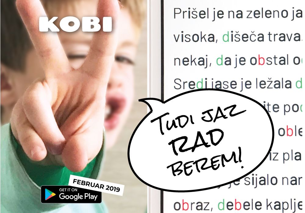 KOBI je pripomoček za učenje branja, namenjen otrokom z disleksijo in drugim, ki jim nagaja členjenje besed in branje nasploh. Kobi besedilo prenese iz tiskovine na tablico in ga prilagodi potrebam posameznika (npr.: različno obarva b in d).