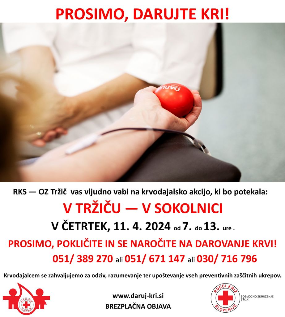 Vljudno vabimo na krvodajalsko akcijo, ki bo potekala v četrtek, 11. 4. 2024 med 7. in 13. uro v Sokolnici. Za odvzem krvi se je potrebno naročiti na telefonski številki Zavoda za transfuzijsko medicino 051/389-270 ali 051/671-147 ali 030/716-796.