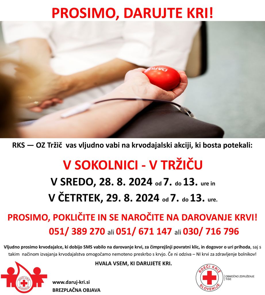 Vljudno vabimo na krvodajalsko akcijo, ki bo potekala v sredo 28.8 in v četrtek 29.8 med 7. in 13. uro v Sokolnici. Za odvzem krvi se je potrebno naročiti na telefonski številki Zavoda za transfuzijsko medicino 051/389-270 ali 051/671-147 ali 030/716-796.
