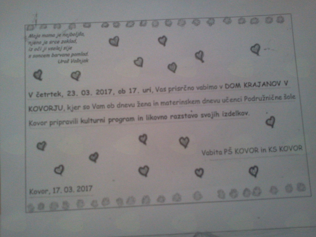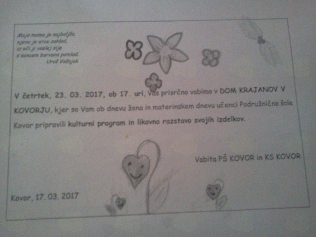 PŠ Kovor in KS Kovor vabita na kulturni dogodek in razstavo svojih del vse matere, mamice in žene v Dom krajanov Kovor. Kot je že v navadi bodo učenci pripravili predstavo, KS Kovor pa bo obdarila udeleženke.