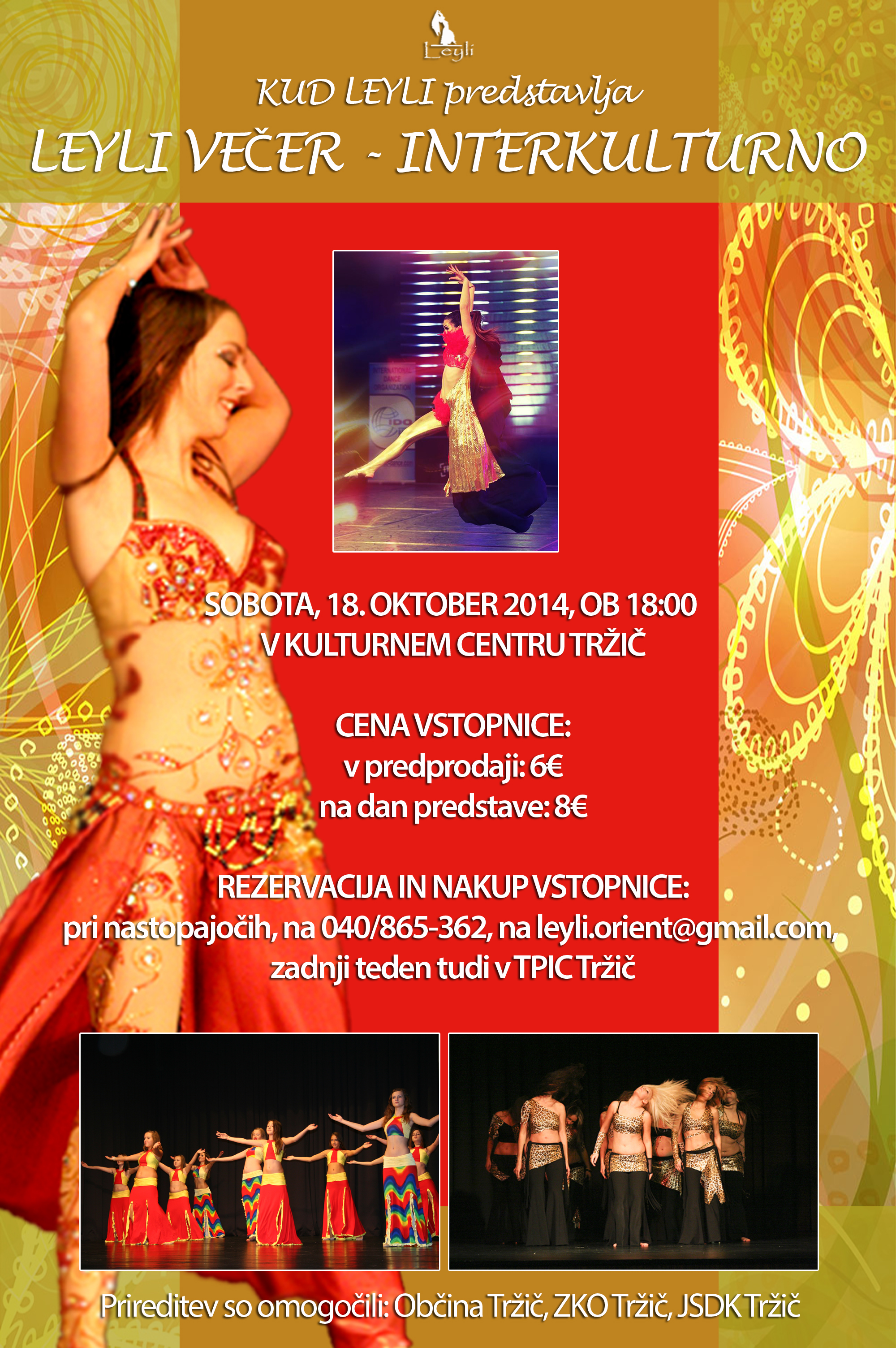 V Kulturnem centru Tržič se bo v soboto, 18. 10. 2014, ob 18:00 s pestrim programom predstavilo okrog 40 nastopajočih iz KUD Leyli. Že od začetka našega delovanja vsako leto na oder postavimo lastno plesno produkcijo, s katero predstavljamo razvoj orientalskega plesa ter zadnji dve leti tudi smernice sodobnega plesa. Letošnje leto smo pripravili predstavo v duhu povezanosti različnih kultur. S plesno interpretacijo ter izborom glasbe iz različnih koncev sveta se bomo dotaknili Grčije, Egipta, ZDA, Indije, Španije in Latinske Amerike ter pokazali, kako tesno se skozi glasbo in ples različne kulture povezujejo med sabo.