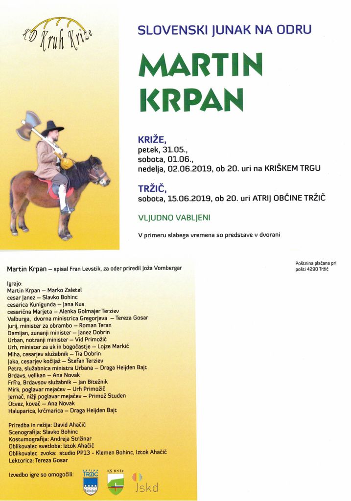 Kulturno društvo Kruh Križe vabi na ogled predstave Martin Krpan, ki bo v Križah 31. 5., 1. 6. in 2. 6. ob 20. uri na Kriškem trgu