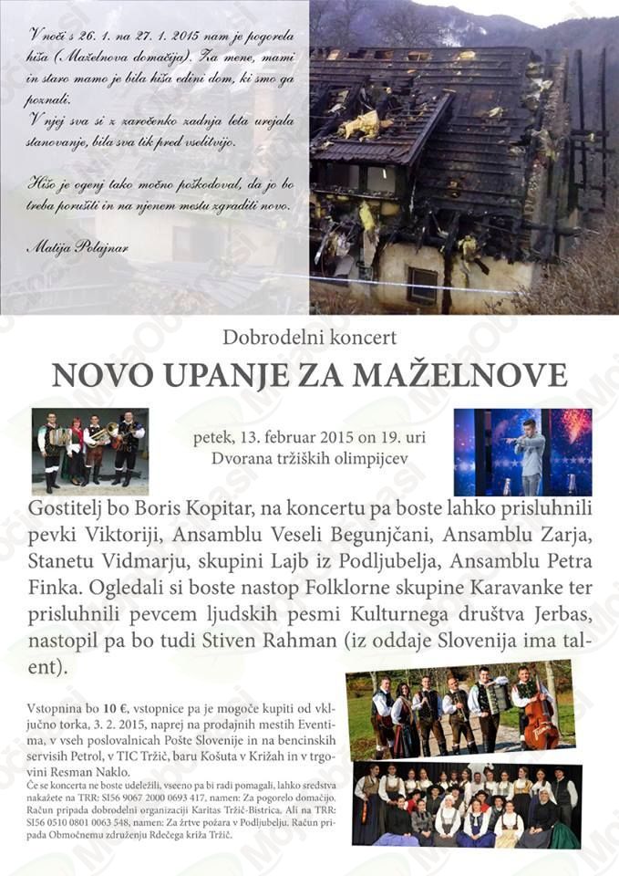 V noči s 26. 1. 2015 na 27. 1. 2015 je pogorela v Podljubelju (občina Tržič) pogorela Maželnova domačija. Hišo je ogenj tako močno poškodoval, da jo bo treba porušiti in na njenem mestu zgraditi novo. V ta namen bo v petek, 13. 2. 2015, ob 19. uri, v Dvorani tržiških olimpijcev organiziran dobrodelni koncert »NOVO UPANJE ZA MAŽELNOVE«.