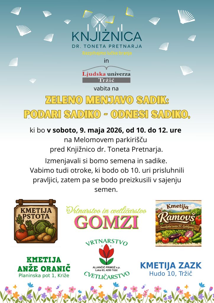 Knjižnica dr. Toneta Pretnarja in Ljudska univerza Tržič vabita na ZELENO MENJAVO SADIK: PODARI SADIKO – ODNESI SADIKO, ki bo v soboto, 9. maja 2026, od 10. do 12. ure na Melomovem parkirišču pred Knjižnico dr. Toneta Pretnarja.
