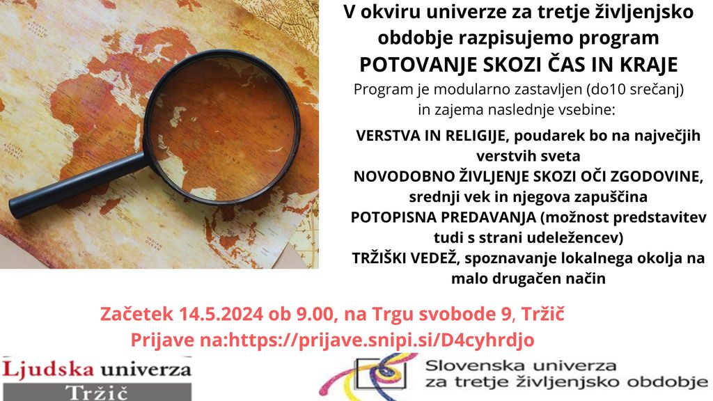 Vas zanima kulturna in verska raznolikost sveta? Kaj so jedli v srednjem veku? Kako so nastale čarovnice in kdo so osebnosti, ki so obogatile človeško civilizacijo? V okviru Univerze za tretje življenjsko obdobje (UTŽO) vas vabimo k udeležbi predavanj z naslovom POTOVANJE SKOZI ČAS IN KRAJE. Srečanja bodo modularno zastavljena (do 10 srečanj).