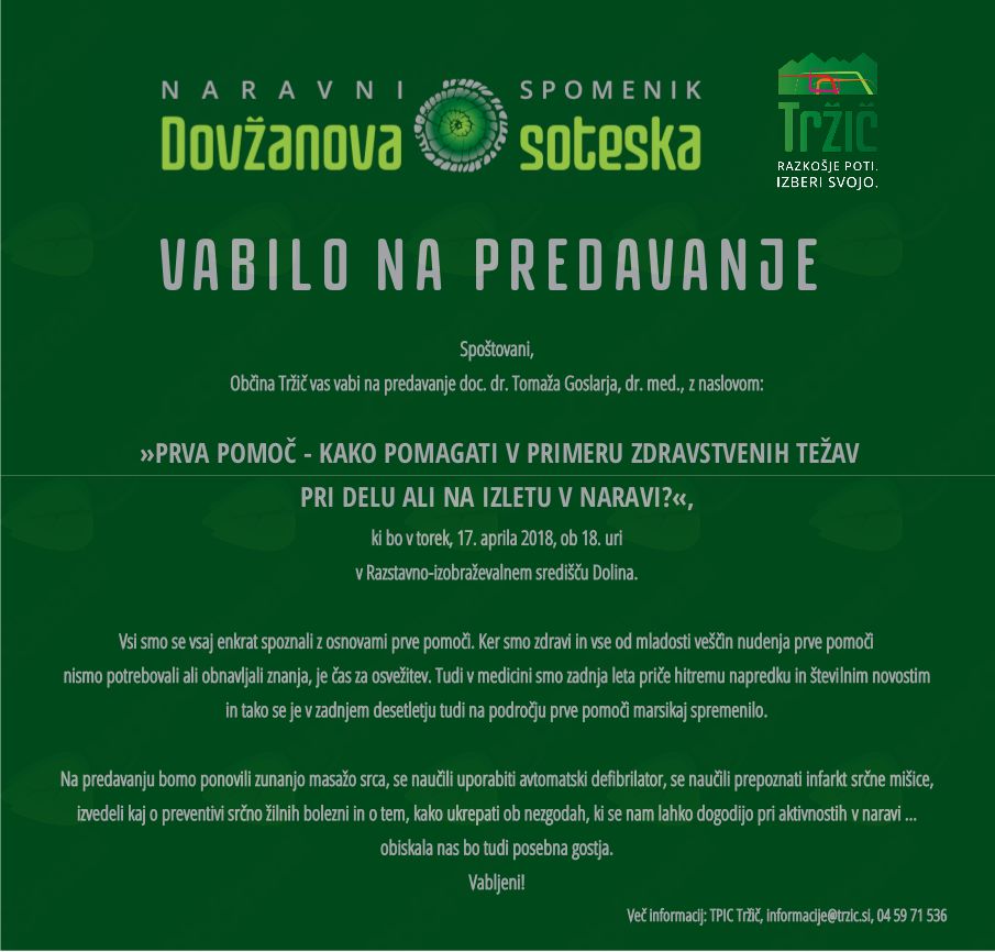 Občina Tržič organizira predavanje doc. dr. Tomaža Goslarja, dr. med., z naslovom: »Prva pomoč - kako pomagati v primeru zdravstvenih težav pri delu ali na izletu v naravi?«, ki bo v torek, 17. aprila 2018, ob 18. uri v Razstavno-izobraževalnem središču Dolina.