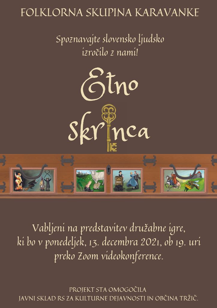 Karavančki smo bili letos zelo pridni. Kljub situaciji, ki nam je večkrat zagodla, nam je uspelo nekaj izjemnega/drugačnega. Z velikim veseljem predstavljamo edinstveno družabno igro - Etno skrinca. Razkrila vam bo zakladnico slovenskega ljudskega izročila, le odpreti jo morate. Vzemite jo s seboj in odkrijte veliko zanimivega.