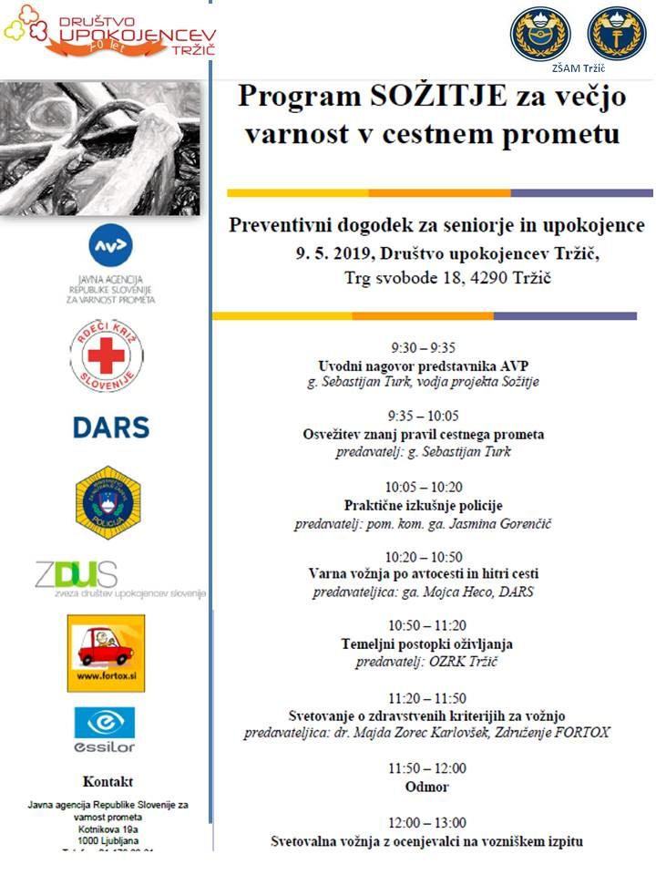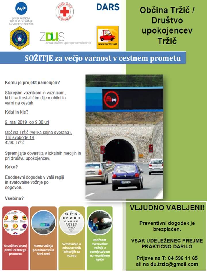 Zaradi predhodno navedenega vas Društvo upokojencev Tržič, ZŠAM Tržič, Javni agenciji Republike Slovenije za varnost prometa , Generalna policijska uprava, DARS, Zvezo društev upokojencev Slovenije, Združenjem FORTOX, z namenom, da bi se kot vozniki in voznice na naših cestah čim dlje počutili varne in čim dlje ostali mobilni, vabimo na dogodek, ki bo v četrtek, 9. maja 2019, ob 9:30 uri, v veliki sejni sobi Občine Tržič, Trg svobode 18. Predviden zaključek je ob 13:00 uri.