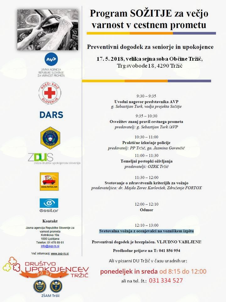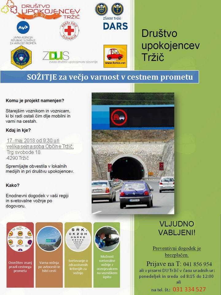Zaradi predhodno navedenega vas Društvo upokojencev Tržič, ZŠAM Tržič, Javni agenciji Republike Slovenije za varnost prometa v sodelovanju z Ministrstvom za infrastrukturo, Generalno policijsko upravo, DARS-om, Zvezo društev upokojencev Slovenije, Združenjem FORTOX, z namenom, da bi se kot vozniki in voznice na naših cestah čim dlje počutili varne in čim dlje ostali mobilni, vabimo na dogodek, ki bo v četrtek, 17. maja 2018, ob 9:30 uri, v veliki sejni sobi Občine Tržič, Trg svobode 18.
