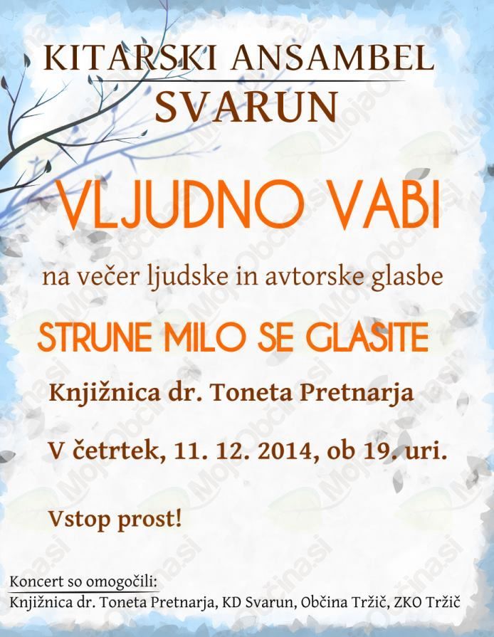Kitarski ansambel Svarun, ki deluje v okviru Kulturnega društva Svarun, vljudno vabi na koncert Strune milo se glasite.