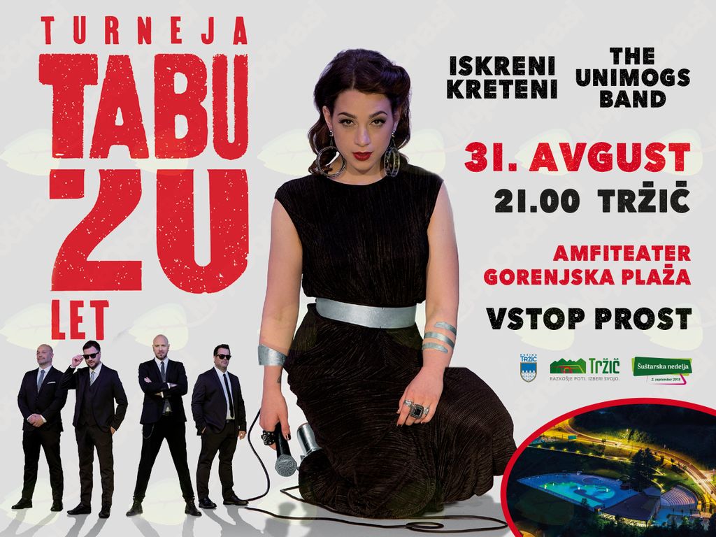 Zadnji dan v avgustu bo na Gorenjski plaži v Tržiču ponovno veselo. Občina Tržič pripravlja v petek, 31. avgusta 2018, od 21. ure dalje veliko zabavo s skupino TABU, ki praznuje 20. letnico delovanja. Za glasbo pred in po koncertu Tabujev, bodo poskrbeli domači Iskreni kreteni in The Unimogs Band. Vstop je prost, za gostinsko ponudbo bosta poskrbela Firbc' okn in ekipa Media butika. Vabljeni.