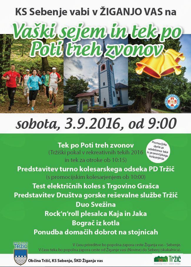Vabljeni na sedaj že tradicionalni Tek po poti treh zvonov, ki se bo odvijal v okviru vaškega sejma v Žiganji vasi.