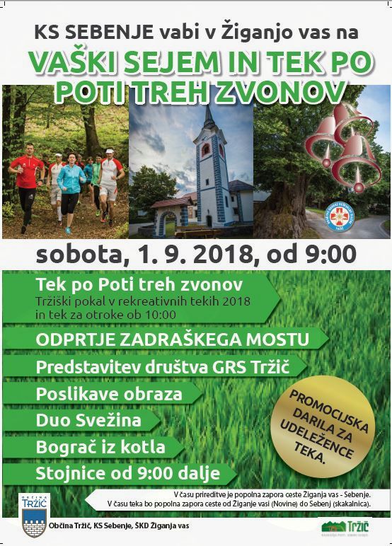 Tek po poti treh zvonov bo v vsakem vremenu. Žal pa zaradi slabega vremena celoten spremljevalni program odpade. Otvoritev Zadraškega mostu smo prestavili na oktobrski vaški sejem, ki bo 6.10.2018 v Sebenjah.