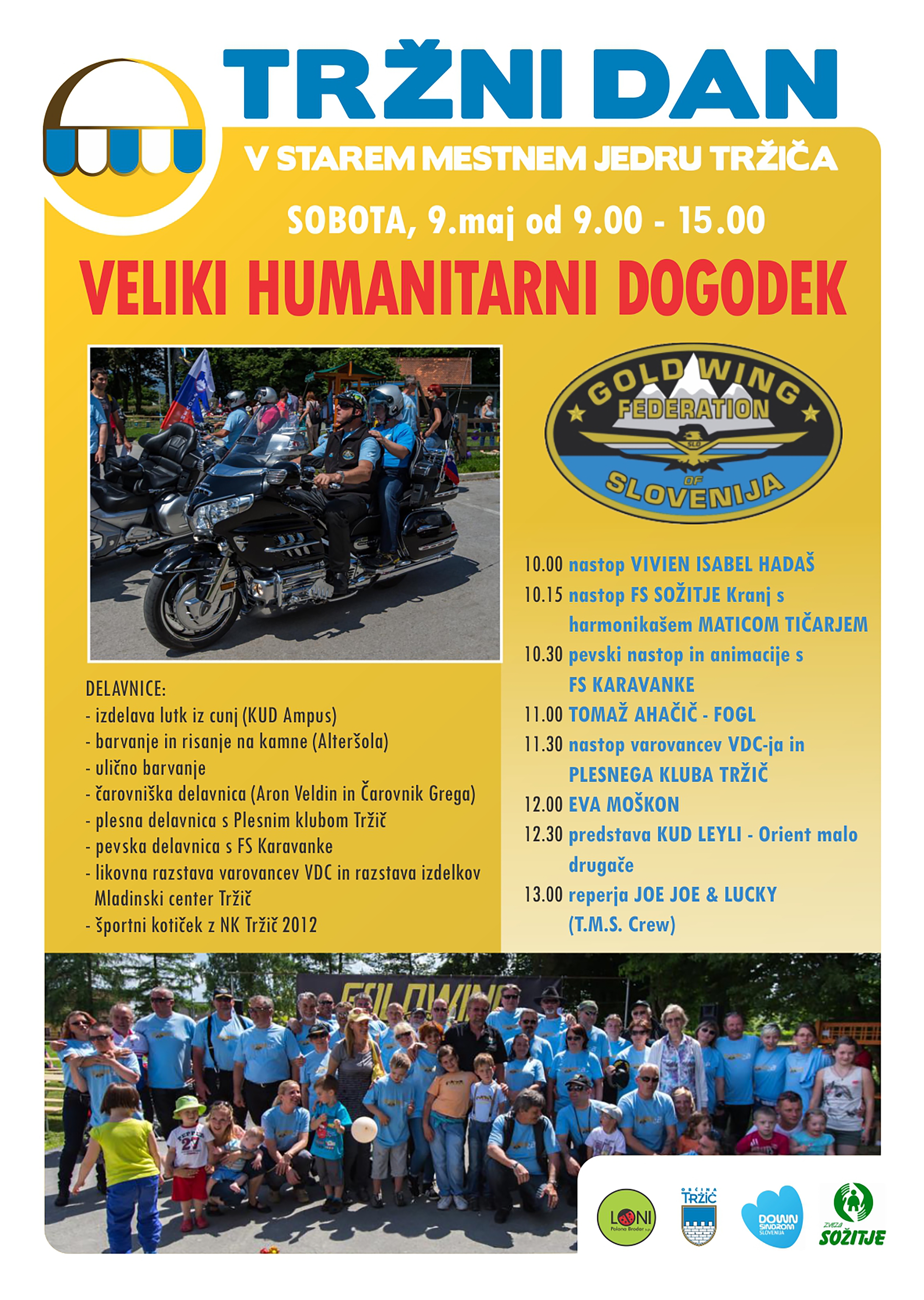 Občina Tržič in Gold Wing Zveza Slovenije na Tržnem dnevu, ki bo v soboto, 9. maja 2015 od 9. do 15. ure v starem mestnem jedru Tržiča, organizirata veliko humanitarno akcijo za otroke in odrasle s posebnimi potrebami. Povabili smo člane društva Downov sindrom Slovenije in pa Zvezo društev Sožitje, ki so pripravili prav poseben predstavitveni program. Ta vključuje njihove plesne nastope, glasbene točke ter razstavo izdelkov. Mi pa bomo poskrbeli, da bo njihov dan nepozaben. Izražali bodo svojo kreativnost, čarali, se preizkusili v športnem kotičku, ter uživali v kulturnem dogodku skupaj s priznanimi glasbenimi in plesnimi izvajalci.
