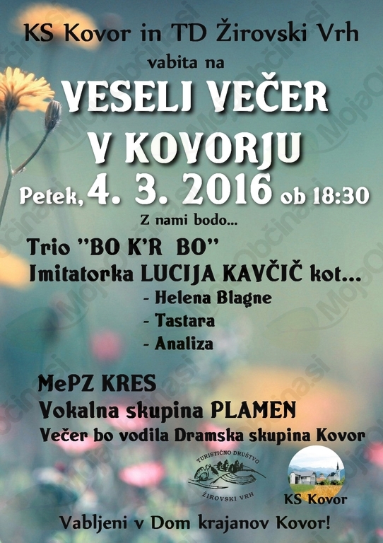 TD Žirovski vrh in KS Kovor vas vabita na VESELI VEČER V KOVORJU, kjer se bodo predstavili: Gostja večera je predsednica TD Žirovski vrh in Imitatorka Lucija Kavčič, člani MePZ KRES iz Kovorja, moška vokalna skupina PLAMEN, novo nastali Trio BO KR BO, vam bo zaigral nekaj ljudskih viž. Večer bo povezovala Dramska skupina iz Kovorja.