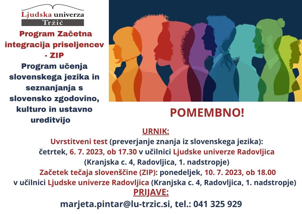 V prostorih Ljudske univerze Radovljica se bo v juliju pričel tečaj slovenskega jezika oz. program ZIP (Začetna integracija priseljencev: učenje slovenščine in seznanjanje s slovensko zgodovino, kulturo in ustavno ureditvijo).