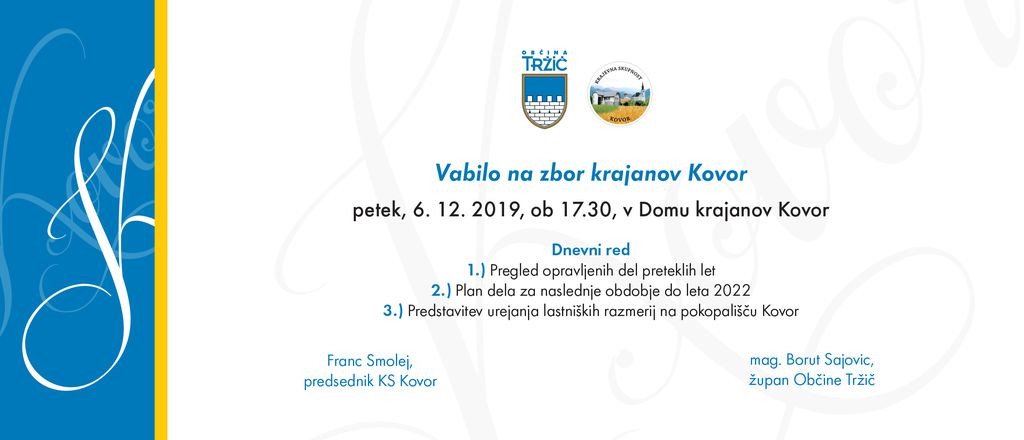 V petek, 6. 12. vabljeni na ZBOR KRAJANOV Kovor.